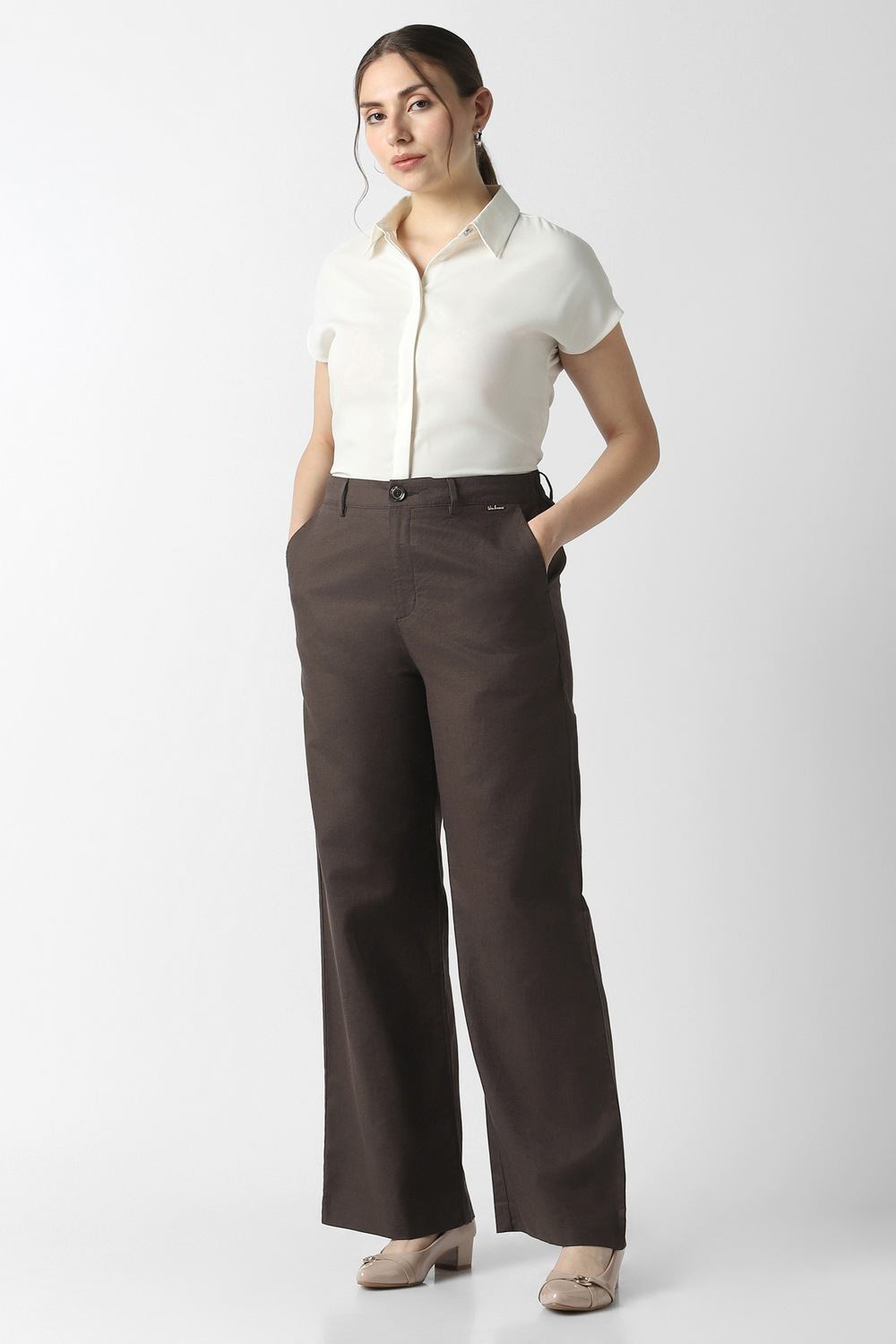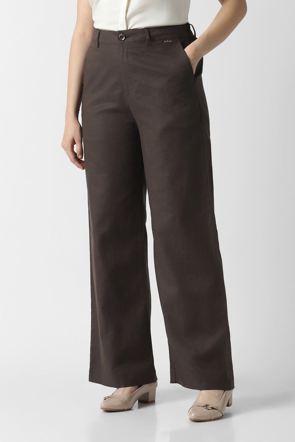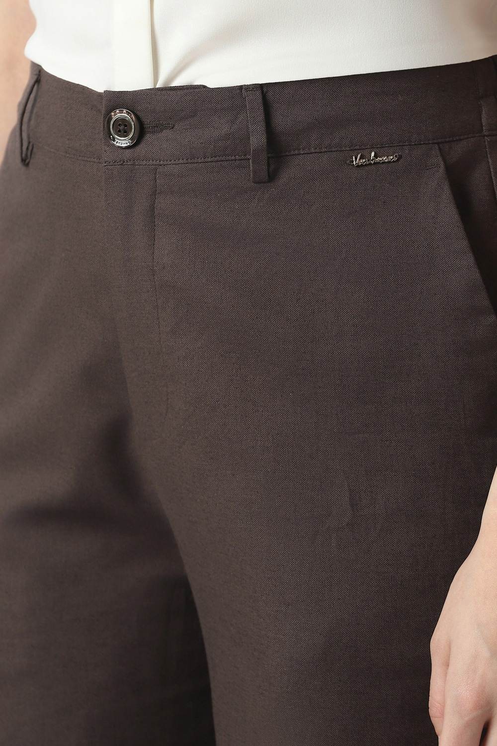Indulge in the sophistication of these brown trousers from Van Heusen, expertly tailored from a luxurious blend of cotton and linen. Perfectly suited for formal occasions, their solid pattern exudes timeless elegance while ensuring a refined aesthetic. The breathable fabric guarantees ease throughout your day, providing a polished finish to any outfit. Designed for the modern woman who values style and practicality, these trousers seamlessly transition from office to evening events, making them an indispensable addition to your collection.