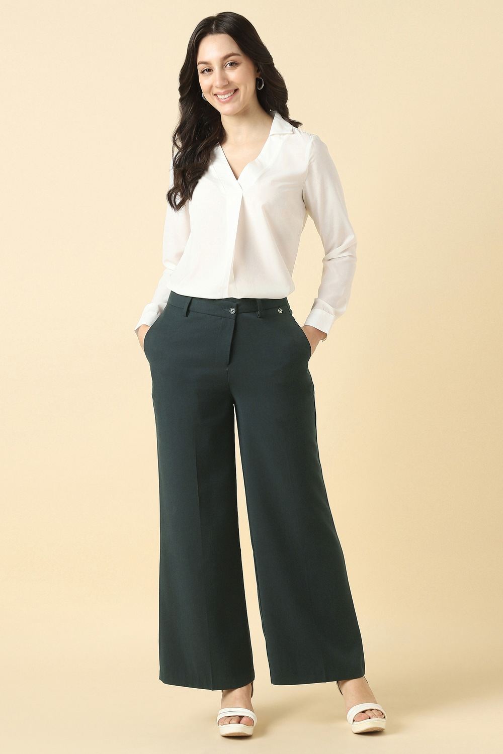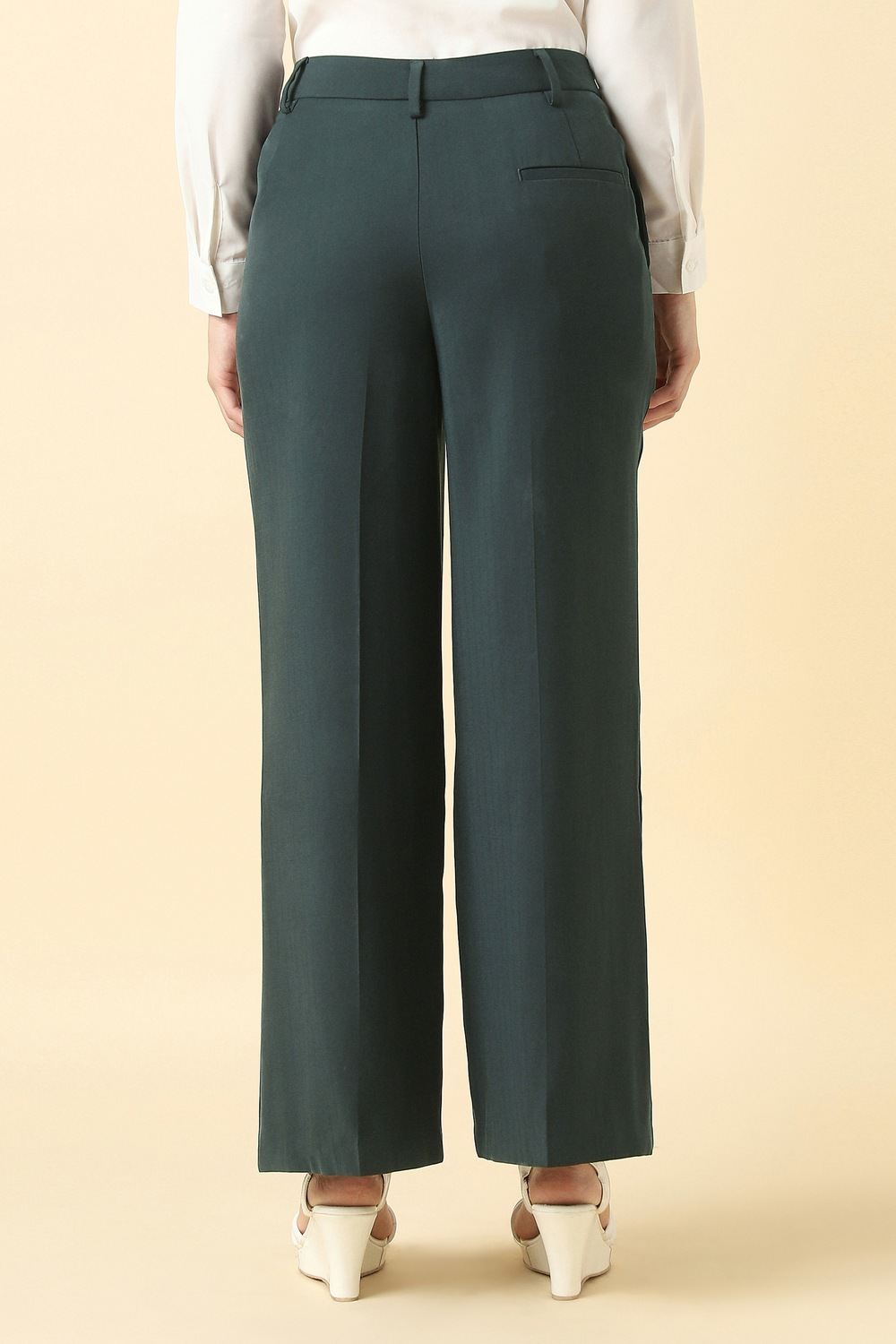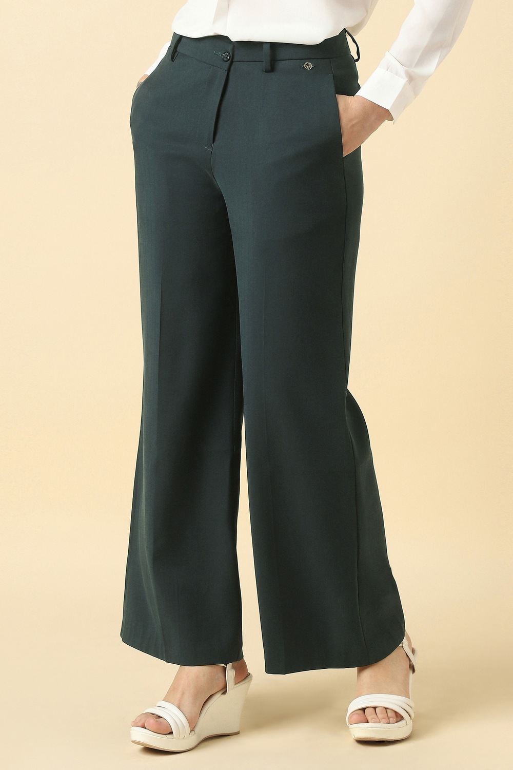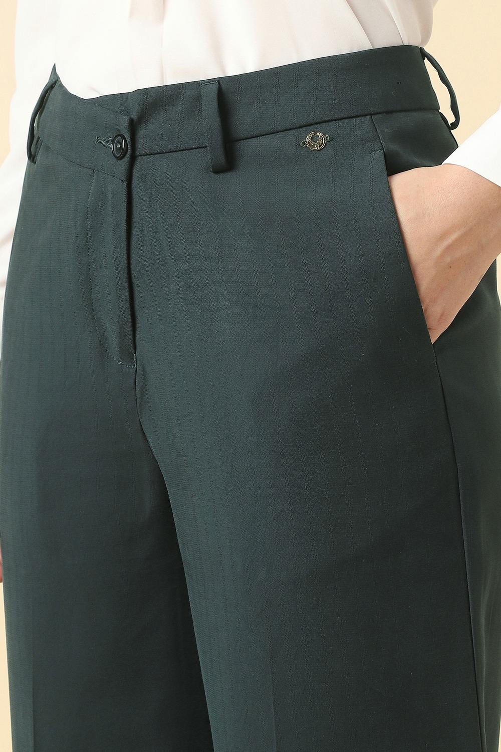 Discover the elegance of Allen Solly's women's green solid trousers, crafted from a versatile polyester and viscose blend. Designed for casual occasions, these trousers offer effortless style while ensuring comfort throughout your day. The solid hue allows for easy pairing with your favorite tops, making them a staple in any wardrobe. Experience the perfect balance of sophistication and practicality that enhances your everyday look.