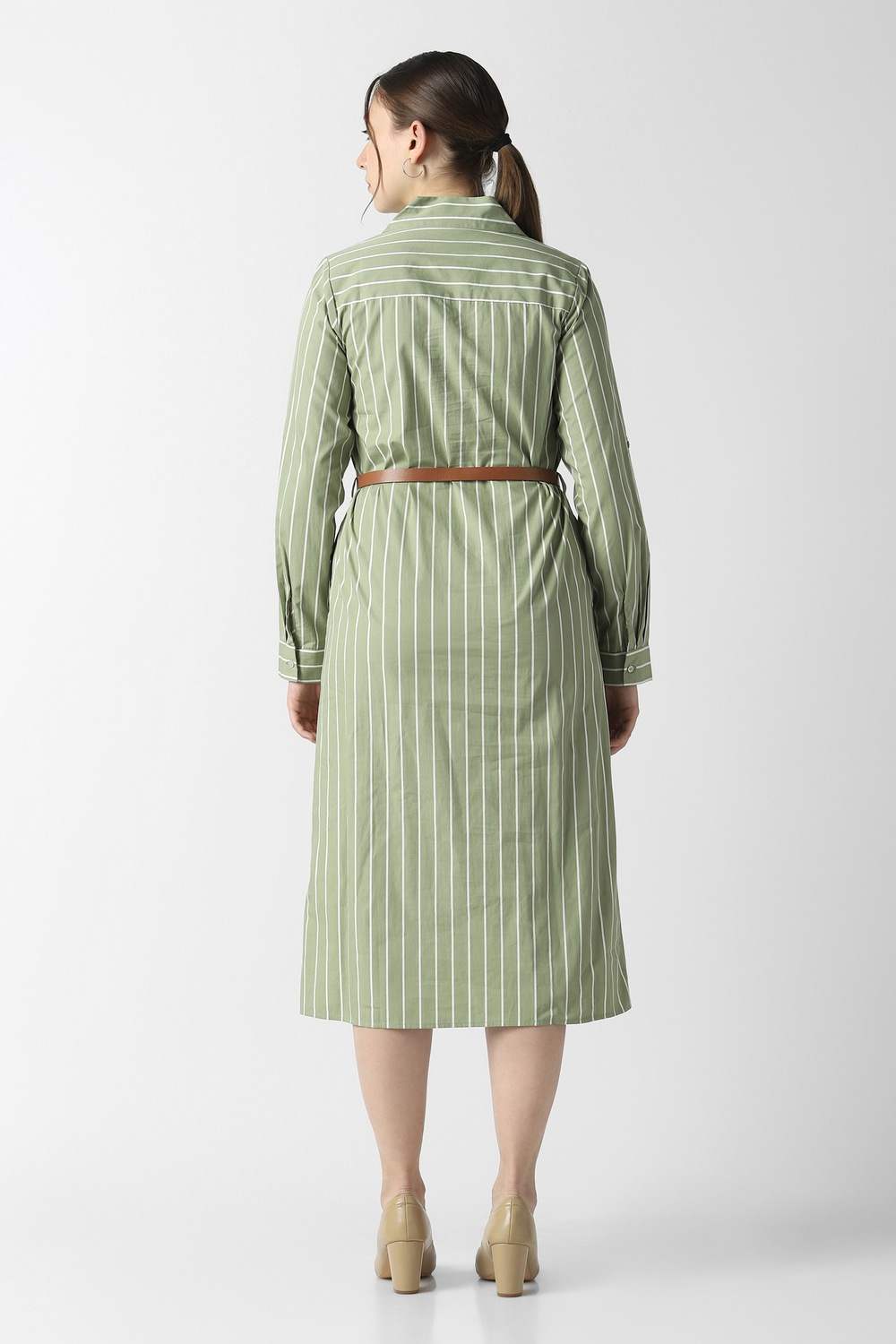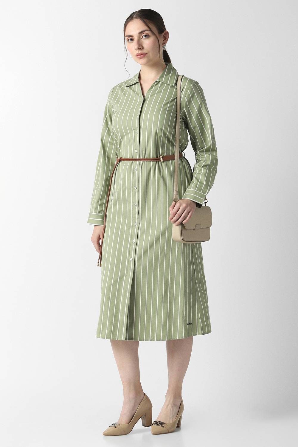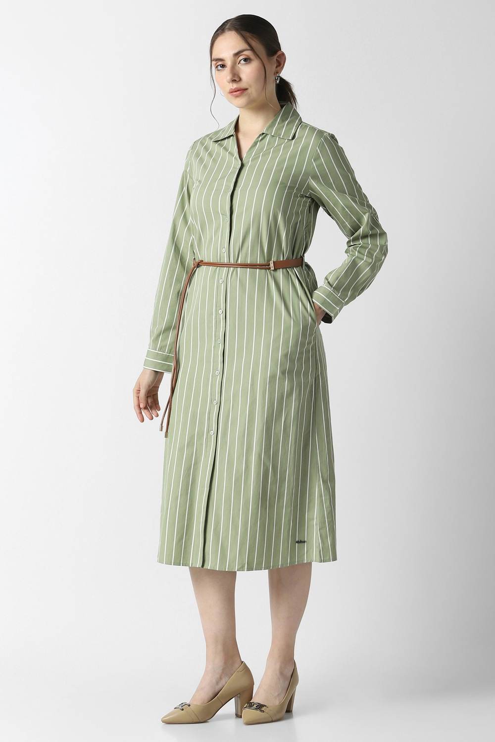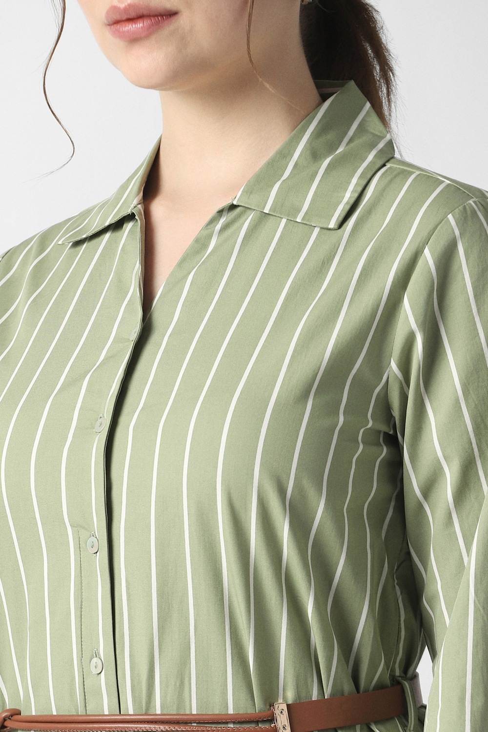 Gracefully designed, this olive striped dress from Van Heusen envelops you in sophisticated charm, ideal for any formal occasion. Made from premium cotton, it offers breathable ease, ensuring your comfort throughout the day. The refined stripe pattern adds a touch of contemporary flair, while the elegant silhouette flatters your figure effortlessly. Merge classic elegance with modern style, making it a treasured addition to your curated collection. Elevate your ensemble with this stunning piece.