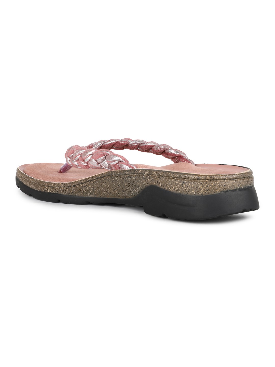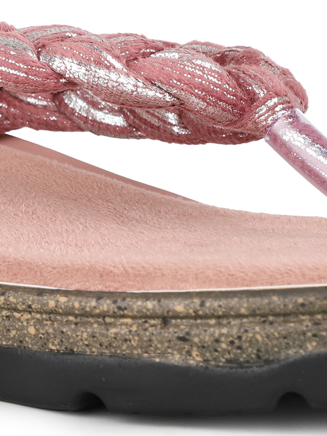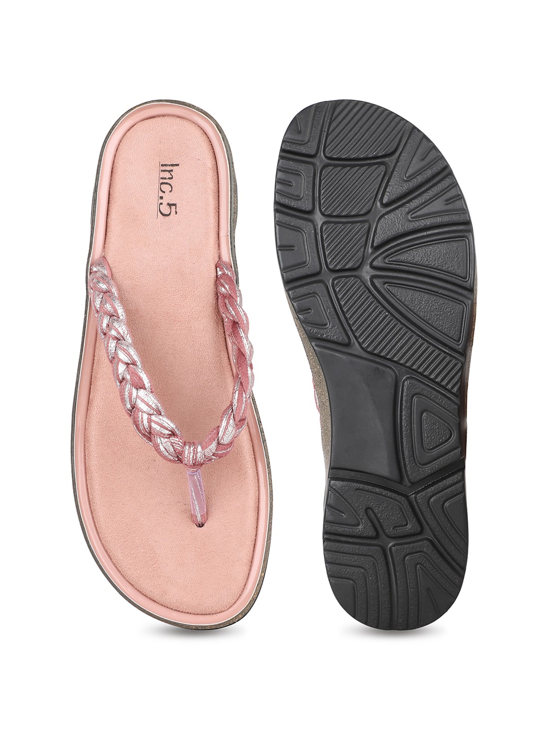 Chic and light, these peach T-strap sandals feature soft embellishments. The flat sole ensures comfort, while the slip-on design makes them a quick pick for casual flair.