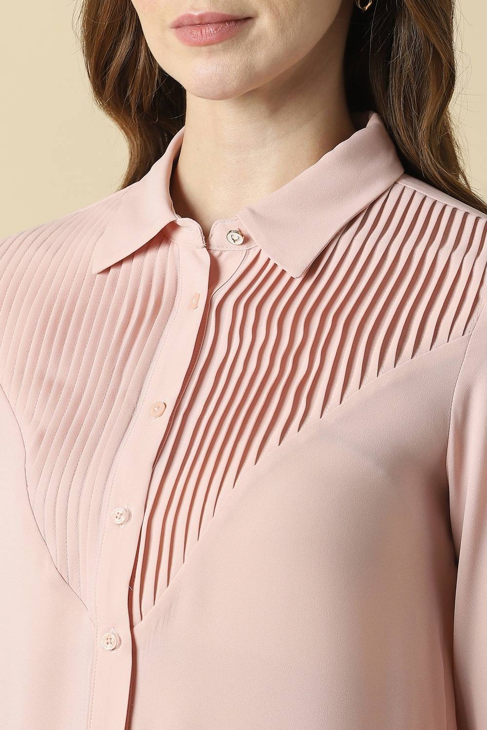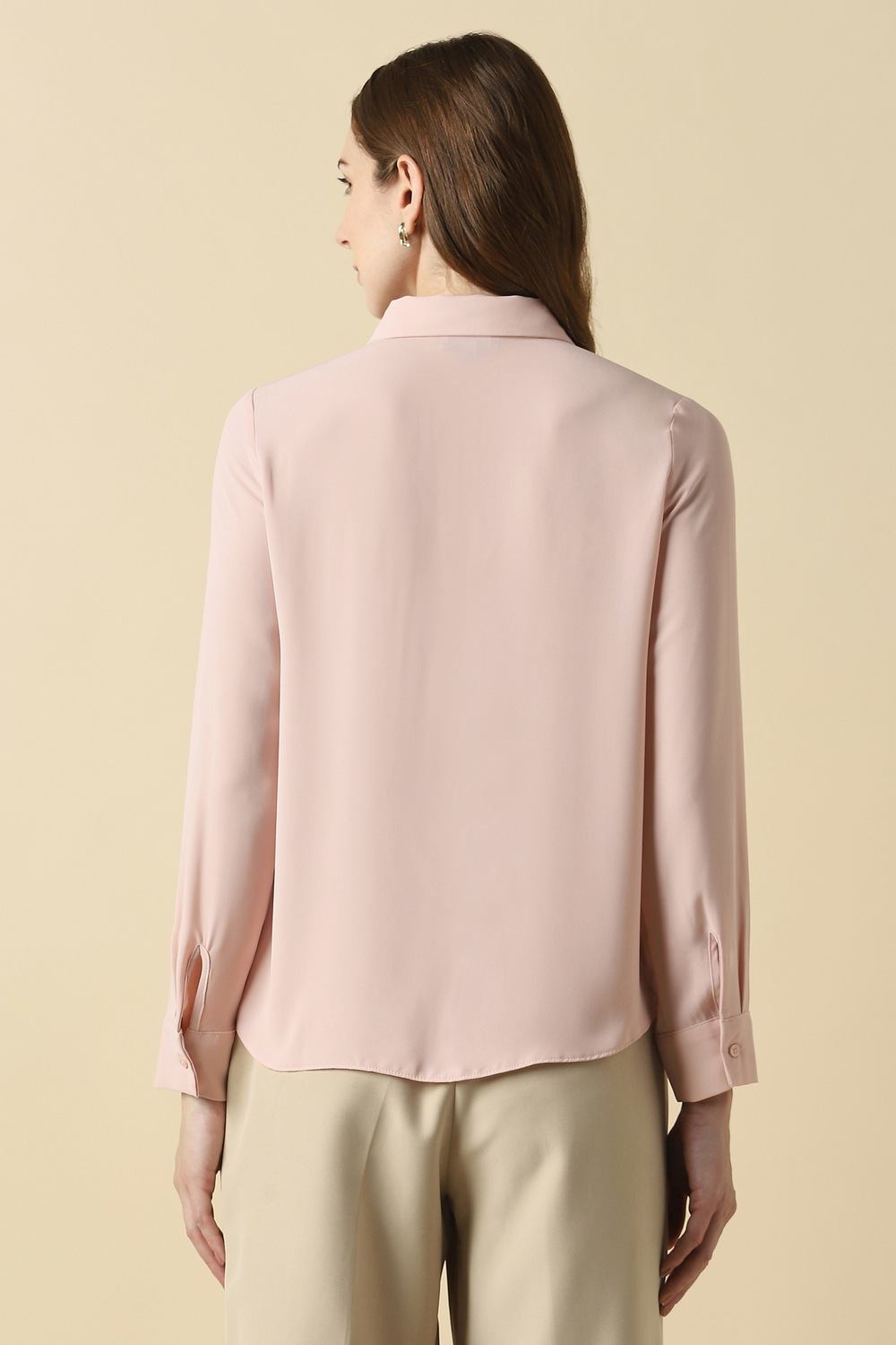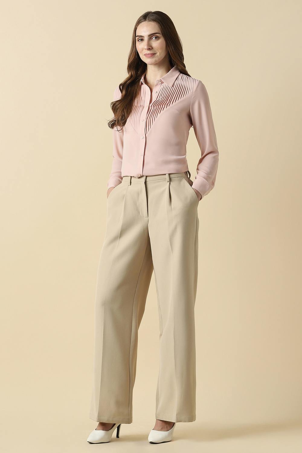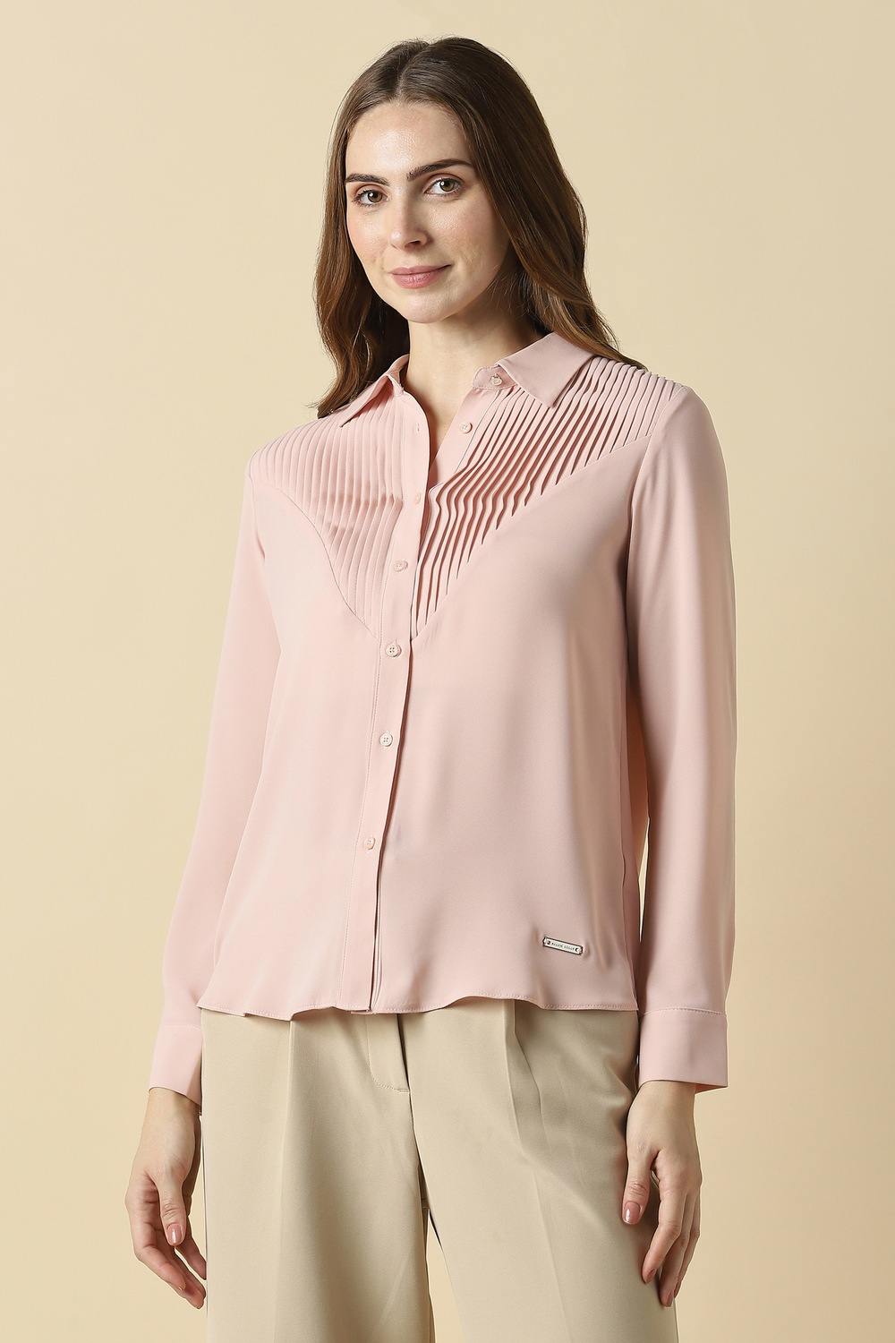 Indulge in the exquisite charm of this solid pink shirt by Allen Solly, designed for the sophisticated woman seeking elegance for formal occasions. Made from luxurious polyester, it offers a polished appearance while ensuring comfort throughout the day. The refined shade of pink adds a touch of vibrancy, whether paired with tailored trousers or a sleek skirt. Elevate your ensemble with this essential piece that embodies grace and style effortlessly.