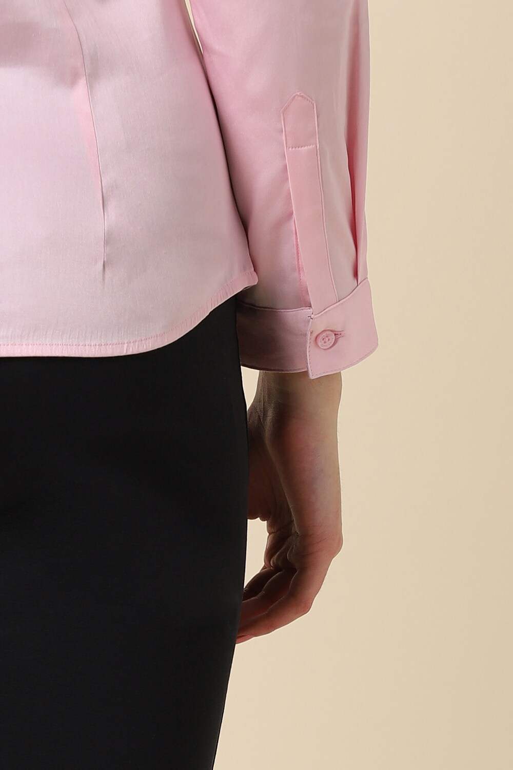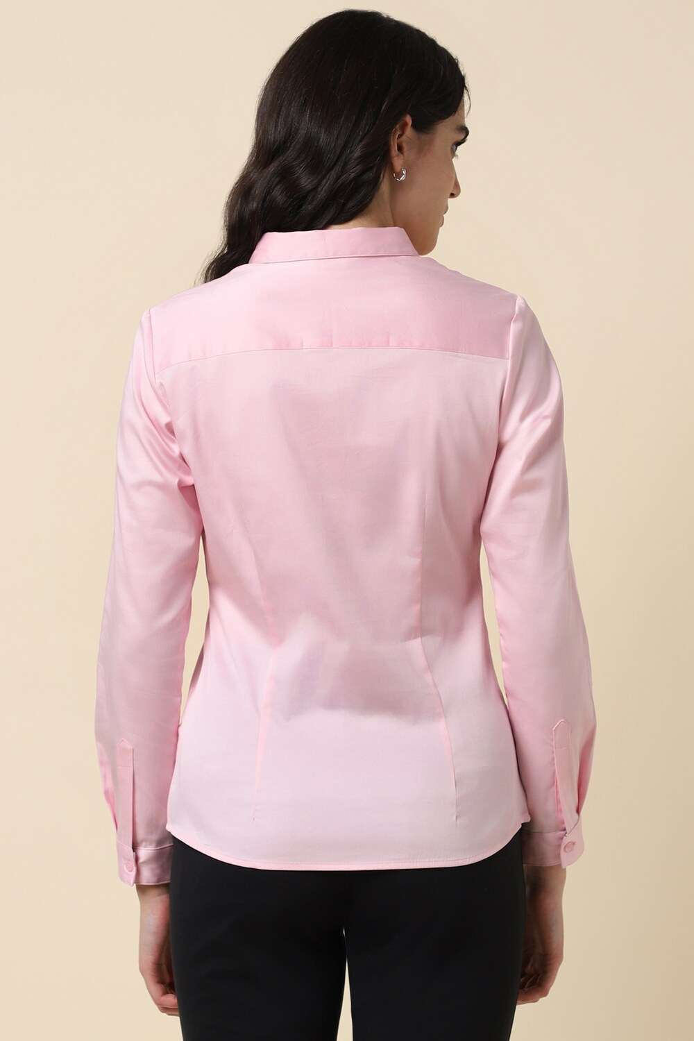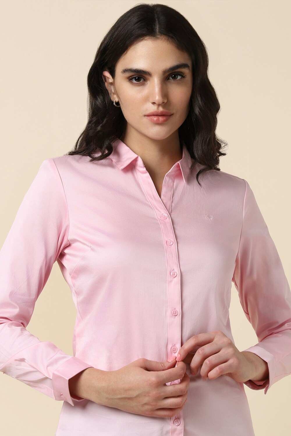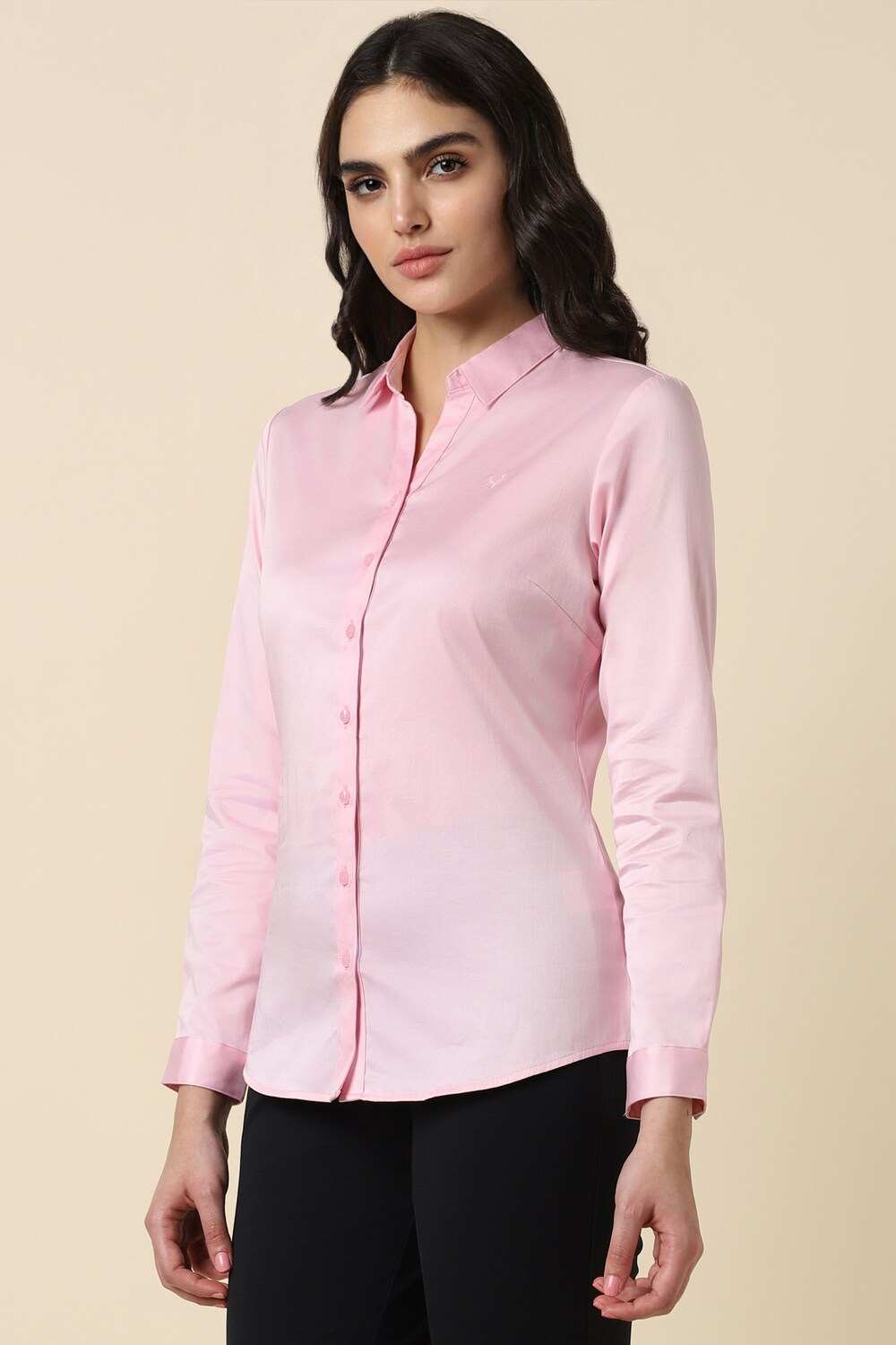 Elevate your formal wardrobe with the Allen Solly women`s shirt in a stunning pink hue. Crafted from a blend of cotton and spandex, this regular-fit shirt ensures all-day comfort without compromising on style. The long sleeves and solid pattern provide a polished look, making it an ideal choice for both office settings and formal occasions. Experience effortless elegance with this versatile piece that embodies sophistication and charm.