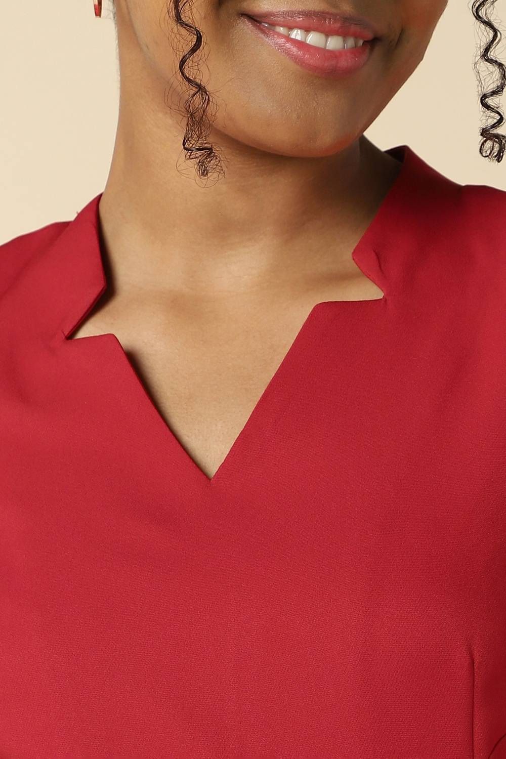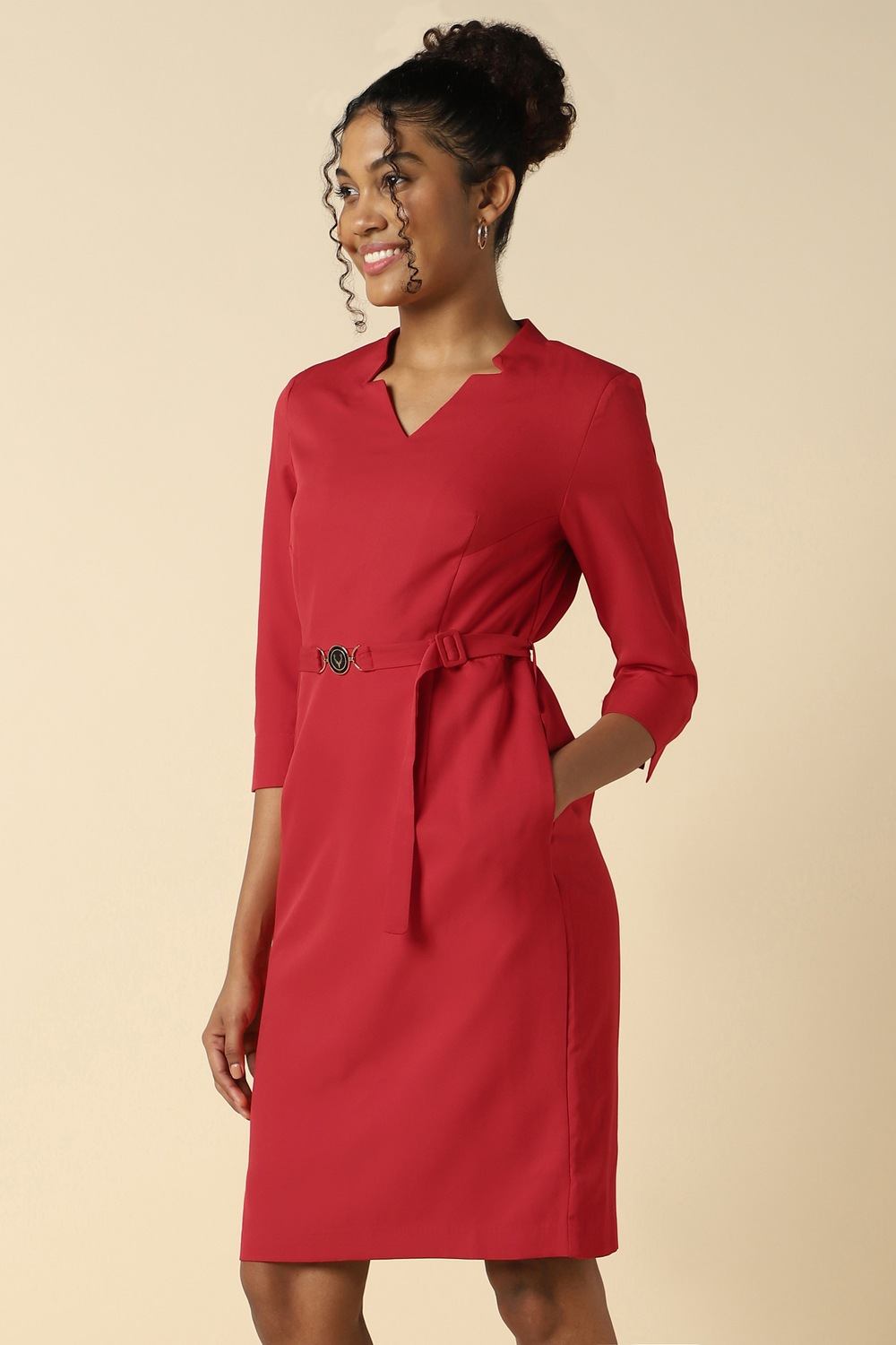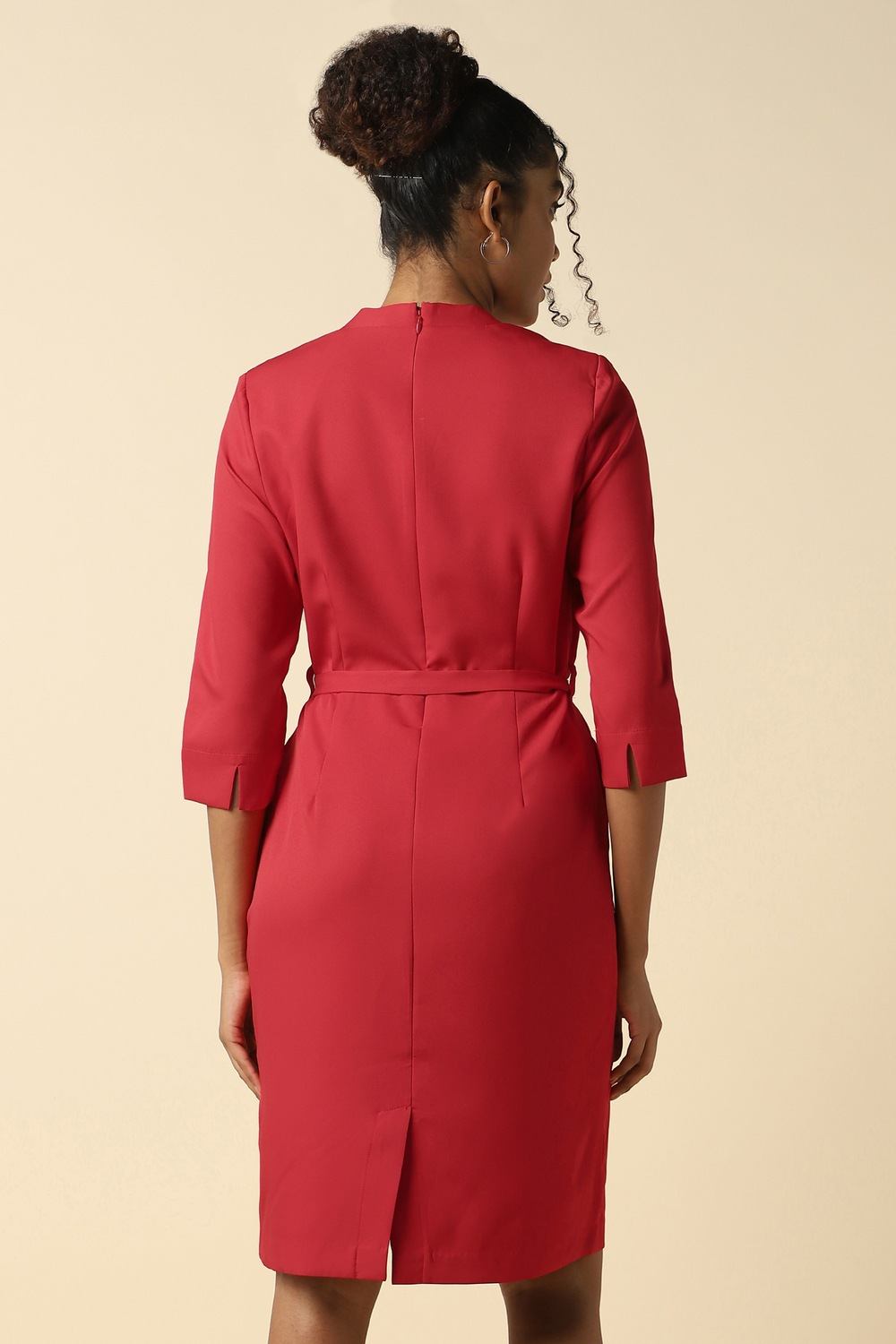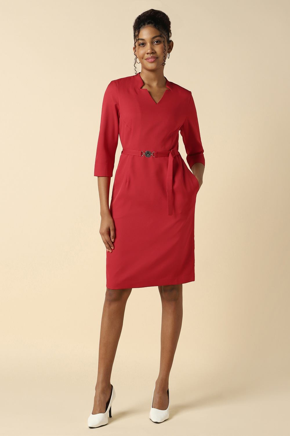 Introducing the Allen Solly women`s dress, crafted from lightweight polyester in a vibrant red hue. This solid piece features a flattering V-neck and elegant 3/4 sleeves, making it perfect for formal occasions. The regular fit ensures comfort without compromising style, while its versatile design pairs effortlessly with your favorite accessories. Make a statement at any event with this sophisticated dress that beautifully balances elegance and modernity.