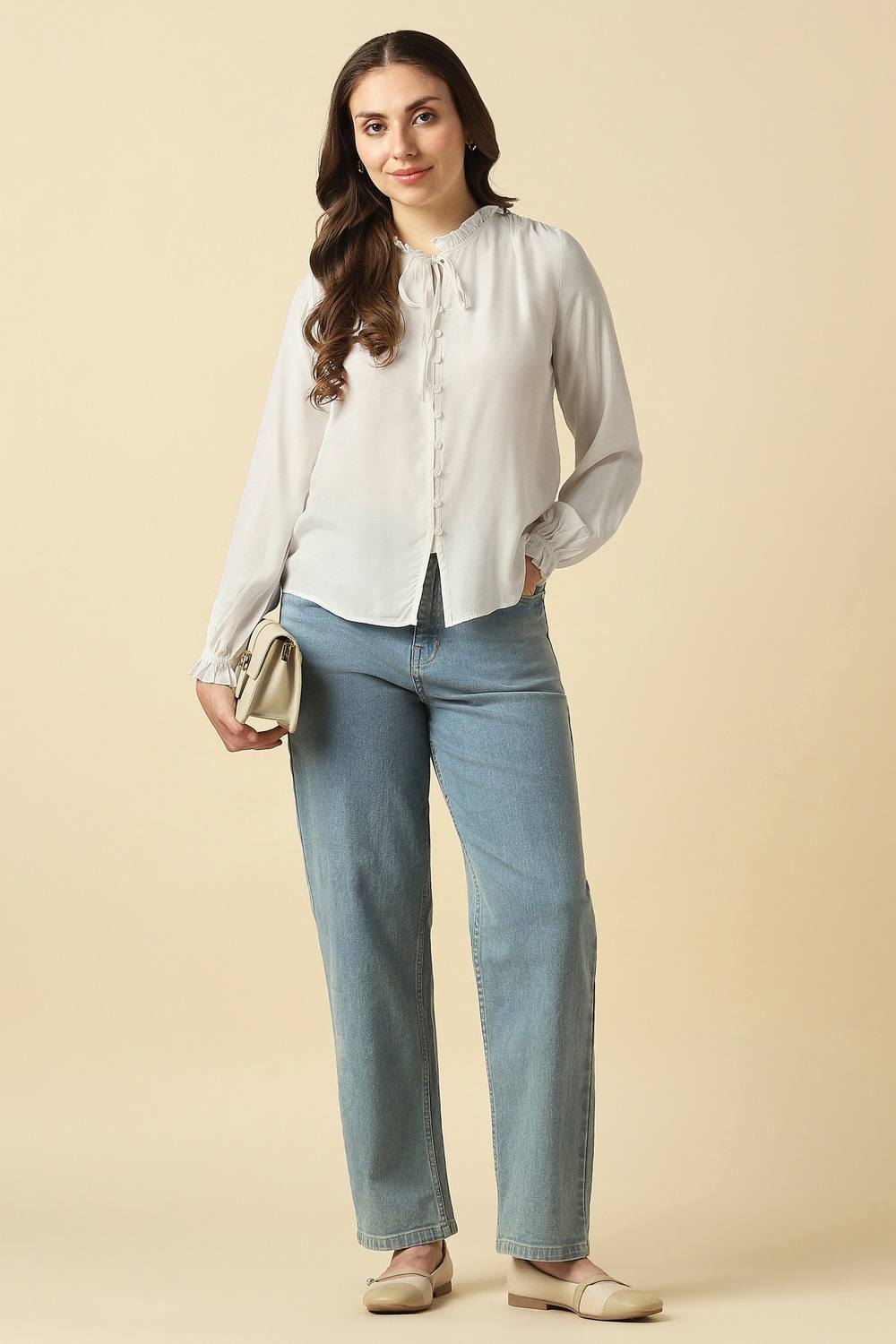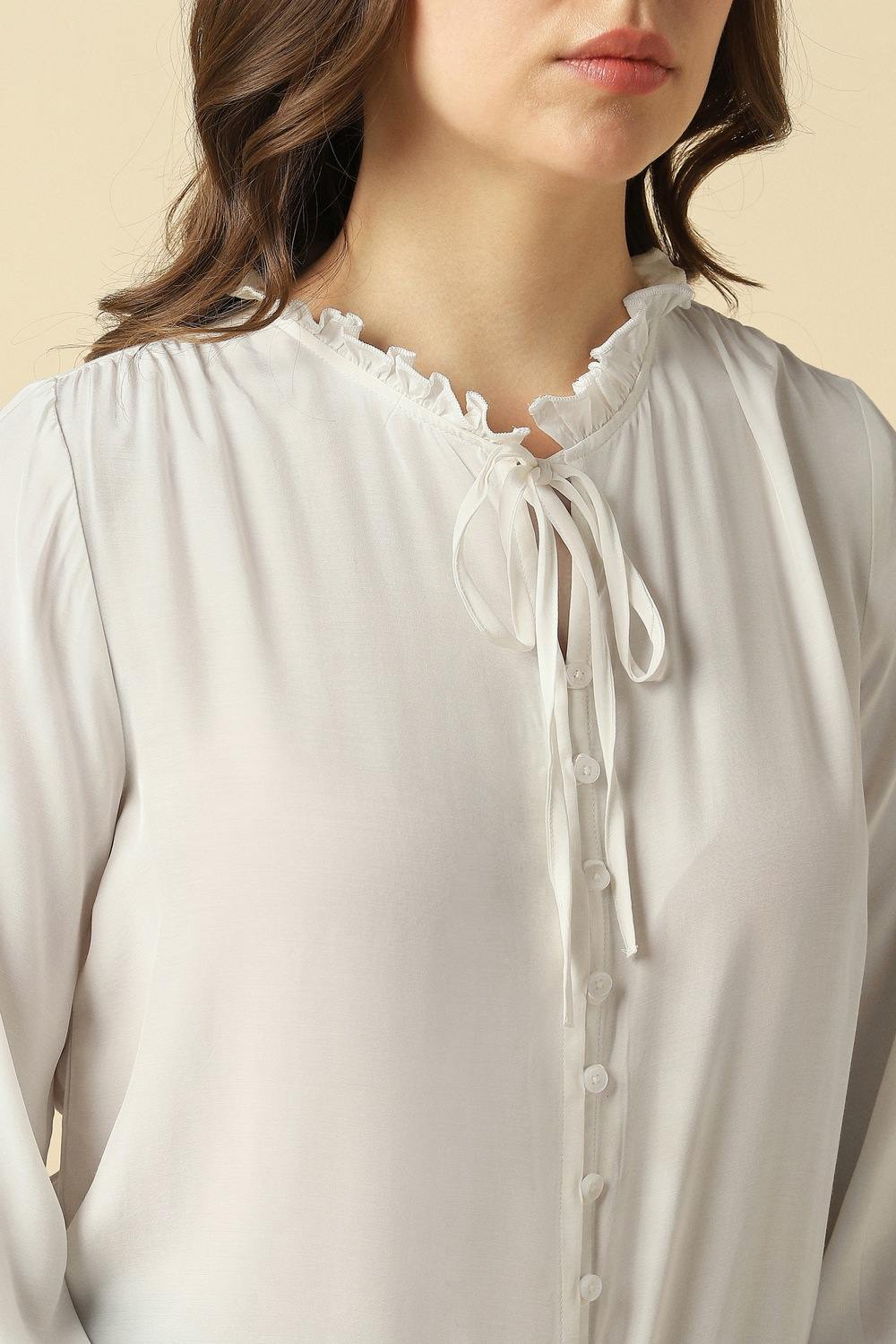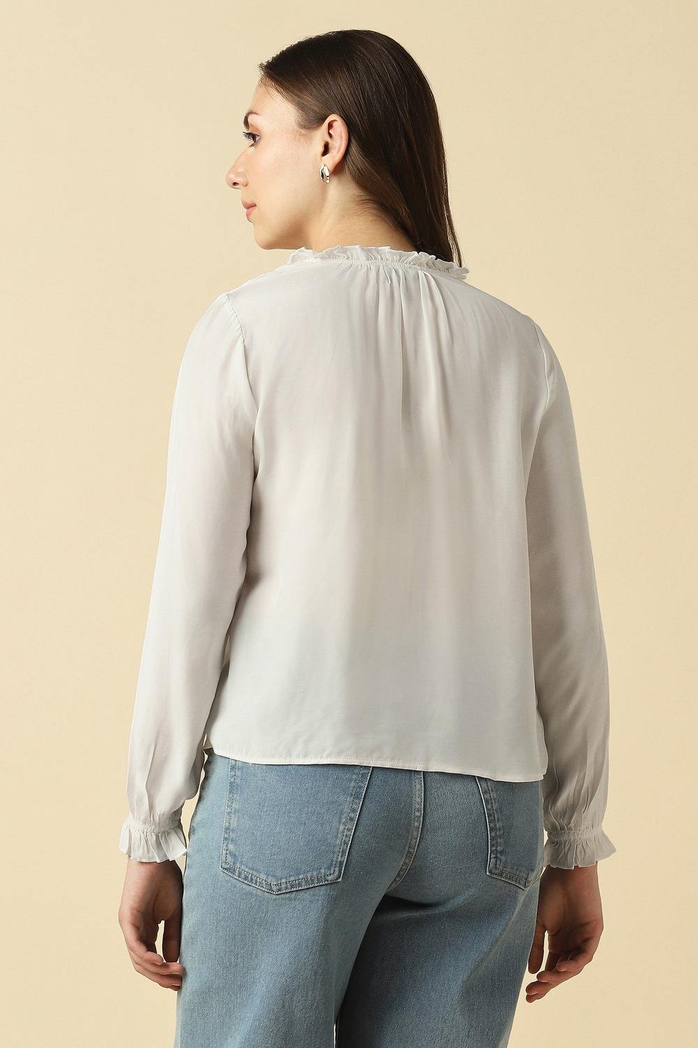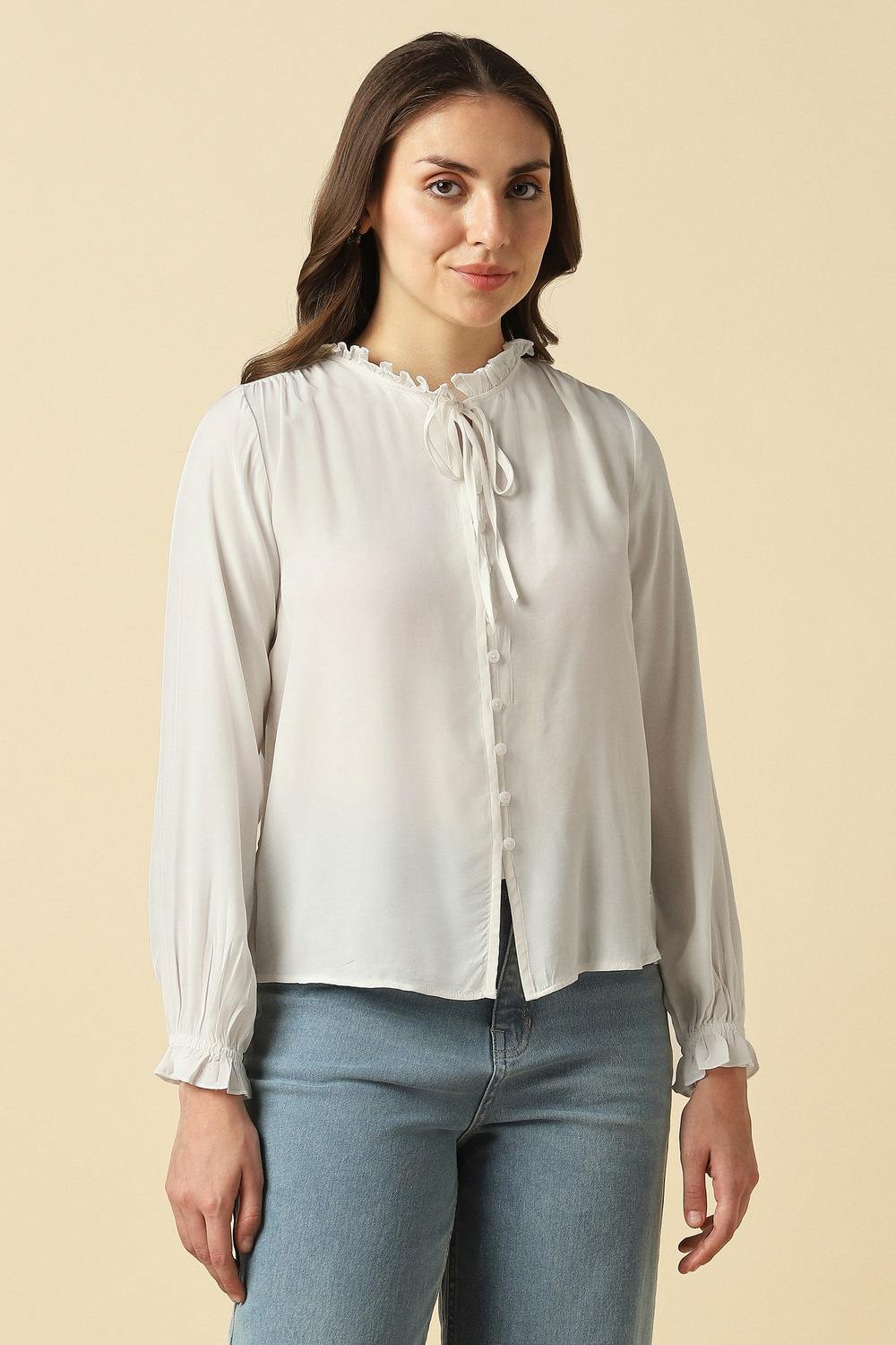 Sophisticated simplicity shines through this white top by Allen Solly, ideal for your casual outings. Made from a luxurious blend of rayon and viscose, it drapes effortlessly while providing a flattering fit. The stylized neckline adds a distinctive flair, making it a versatile choice for various occasions. Pair it with denim for a chic everyday look or dress it up with tailored trousers – a timeless addition to your collection.