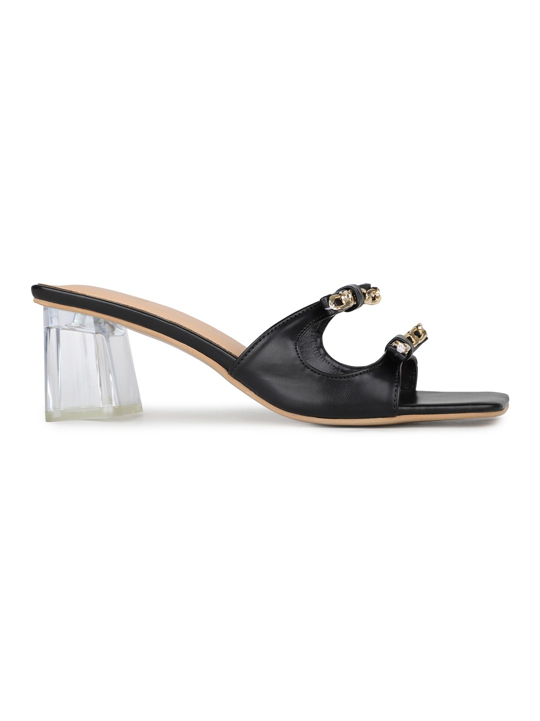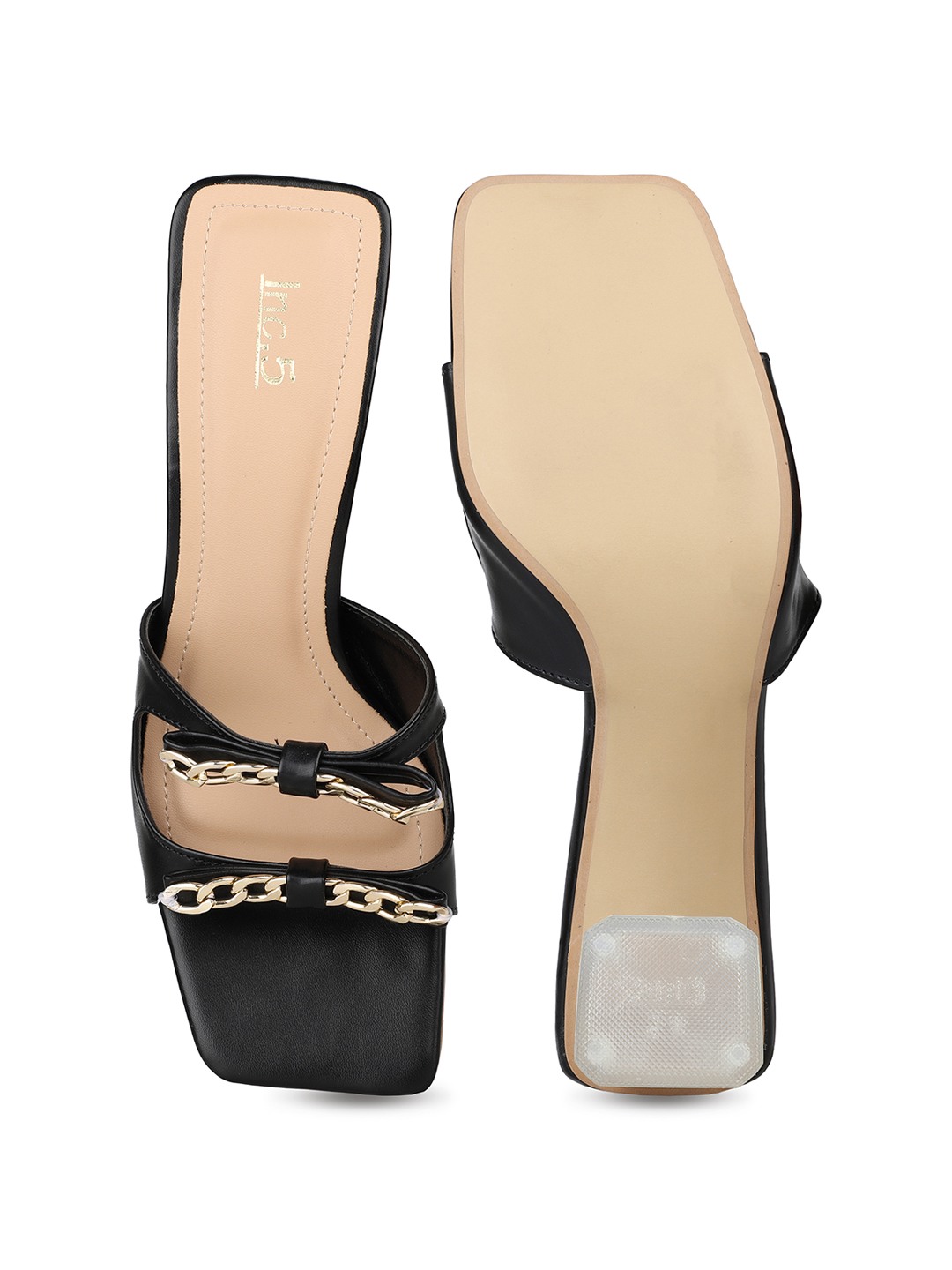 These black embellished square-toe block heel sandals are perfect for a chic party look. The square toe and block heel provide both style and comfort, while the embellishments add extra flair.