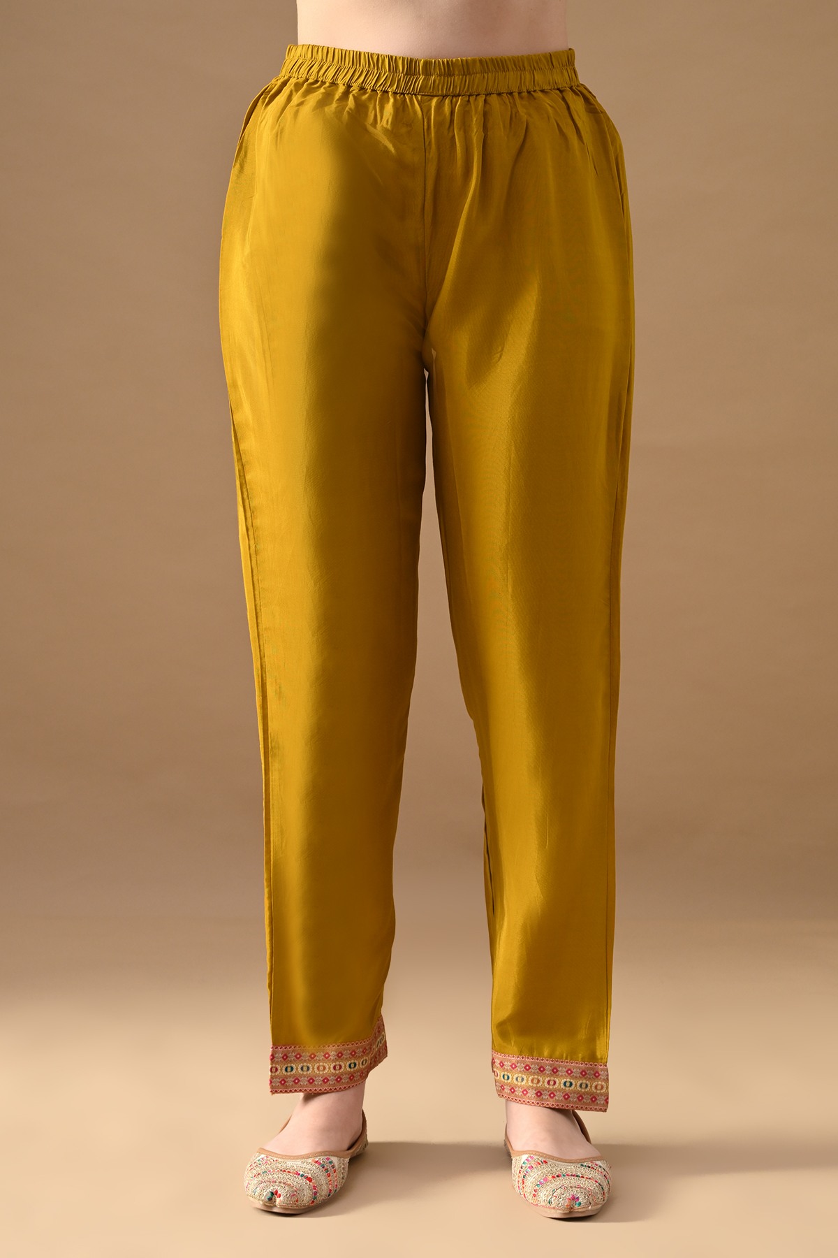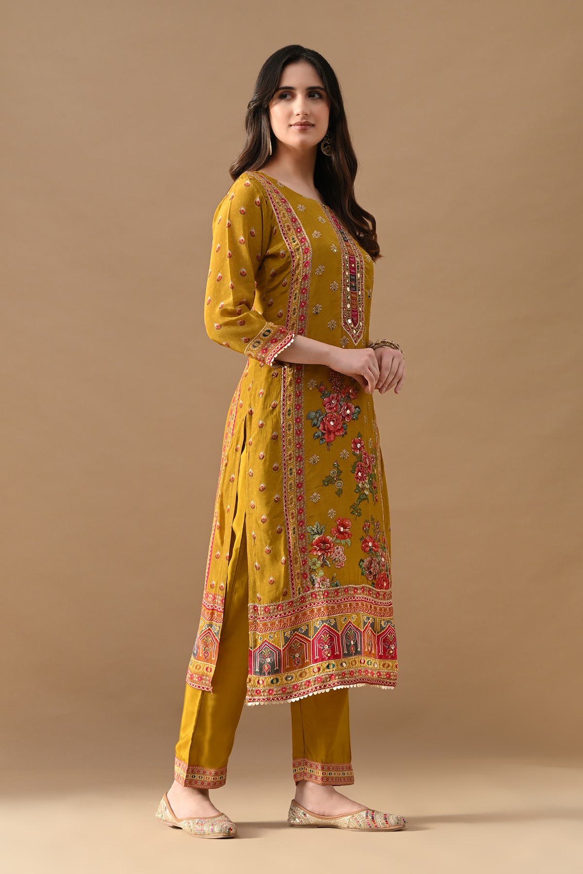 This elegant yellow embroidered straight kurta set with the subtle touch of stone work. features a round neck, three-quarter sleeves, side slit, and straight hemline. paired with matching pants and dupatta, it blends traditional charm and modern style, perfect for any occasion.