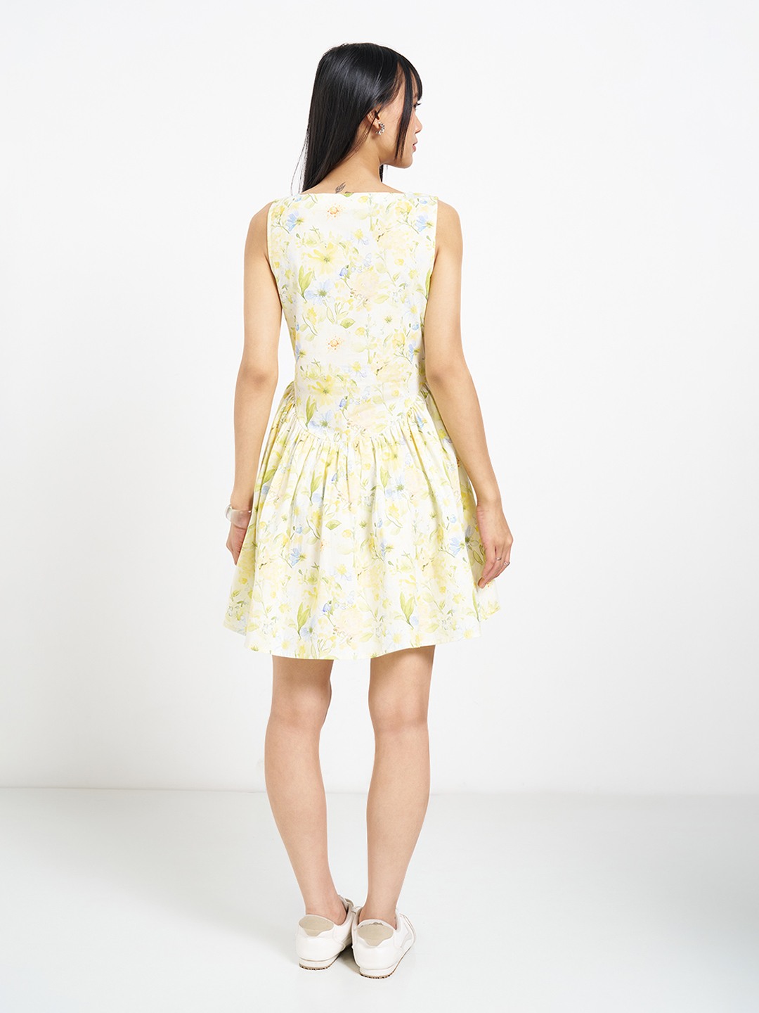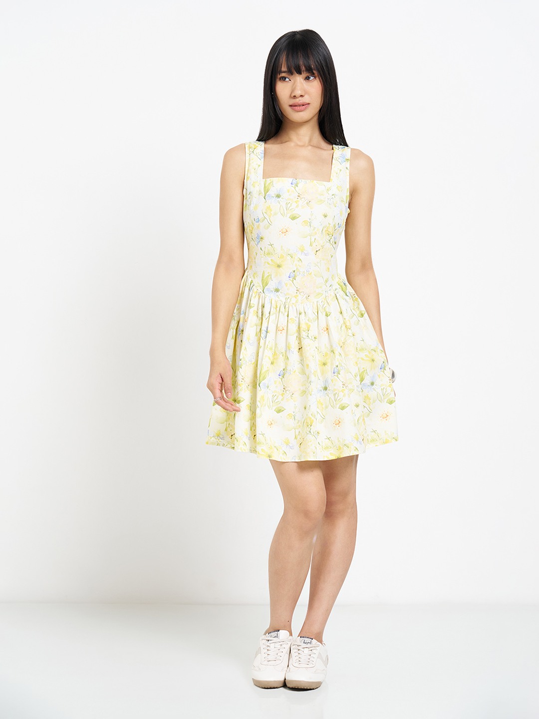 Sunlit and sharply defined. Designed with a square neckline and wide straps, it features a defined bodice that drops into a gathered mini skirt with soft volume and clean waist shaping. The structured silhouette holds form while allowing easy movement.