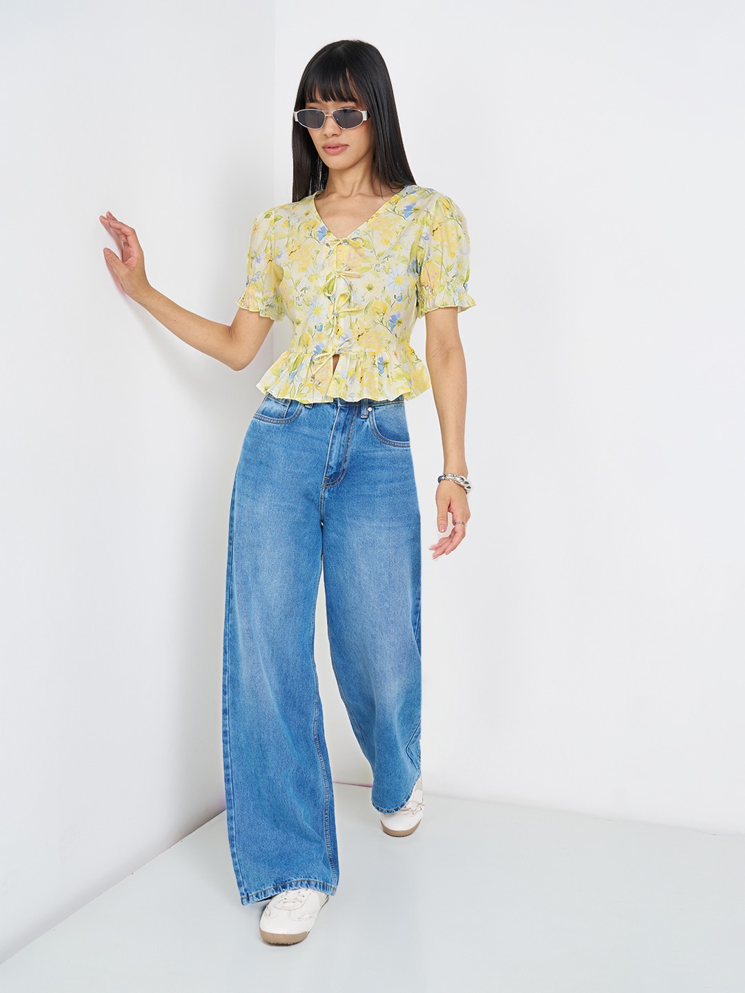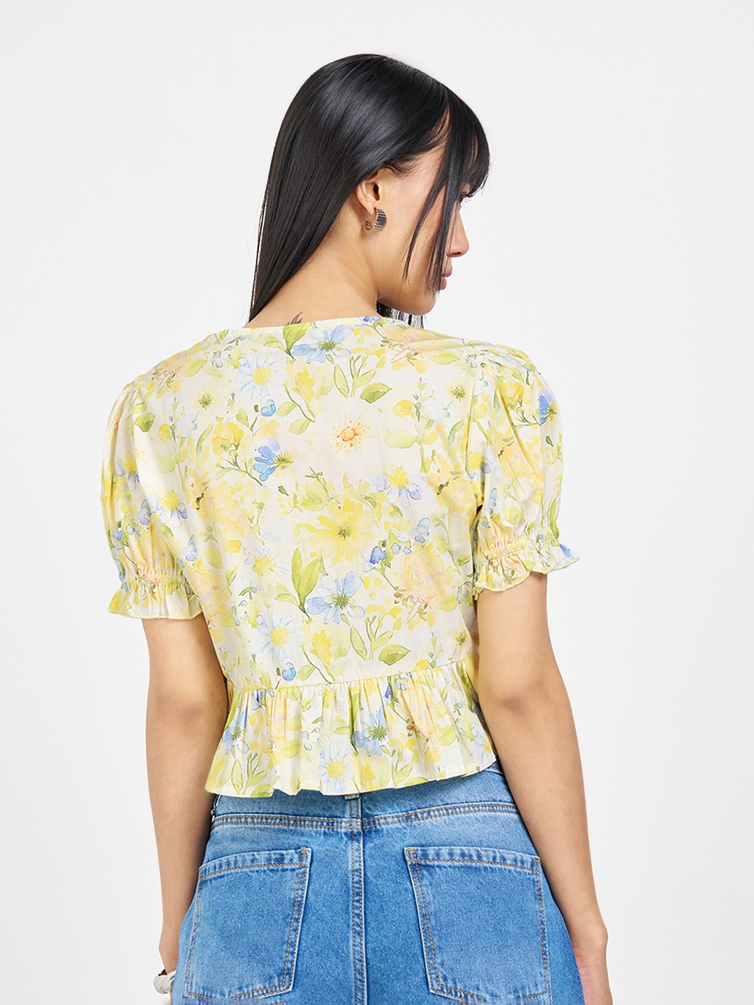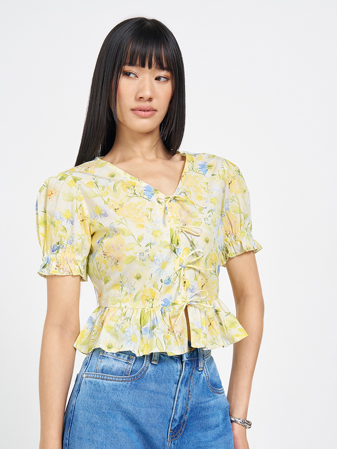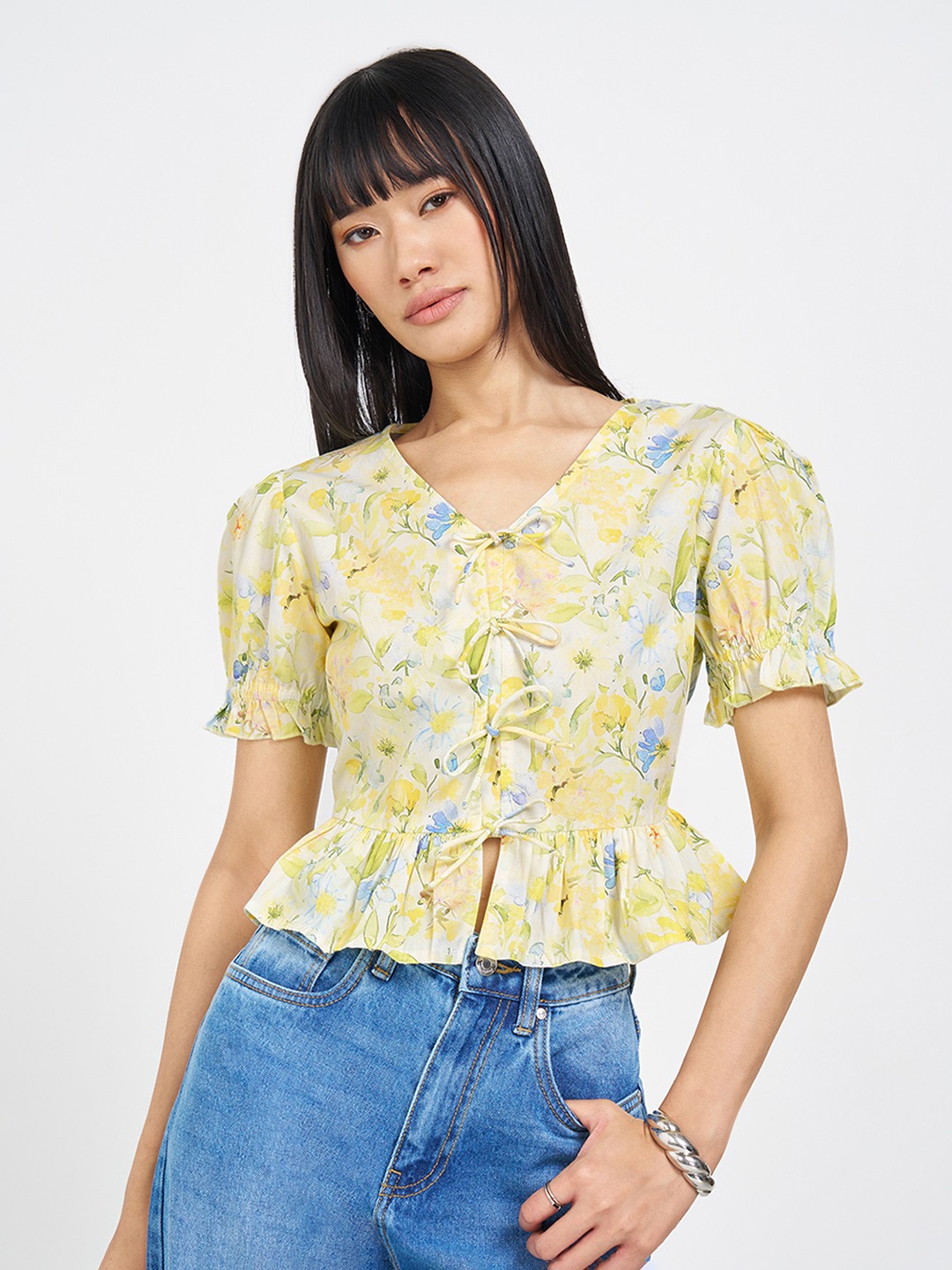 A compact silhouette with softly romantic volume. This shirt features a pointed collar, full button-through front, puff sleeves and a cropped length that sharpens the shape. Crafted in a lightweight textured woven fabric with a subtle crinkled surface.