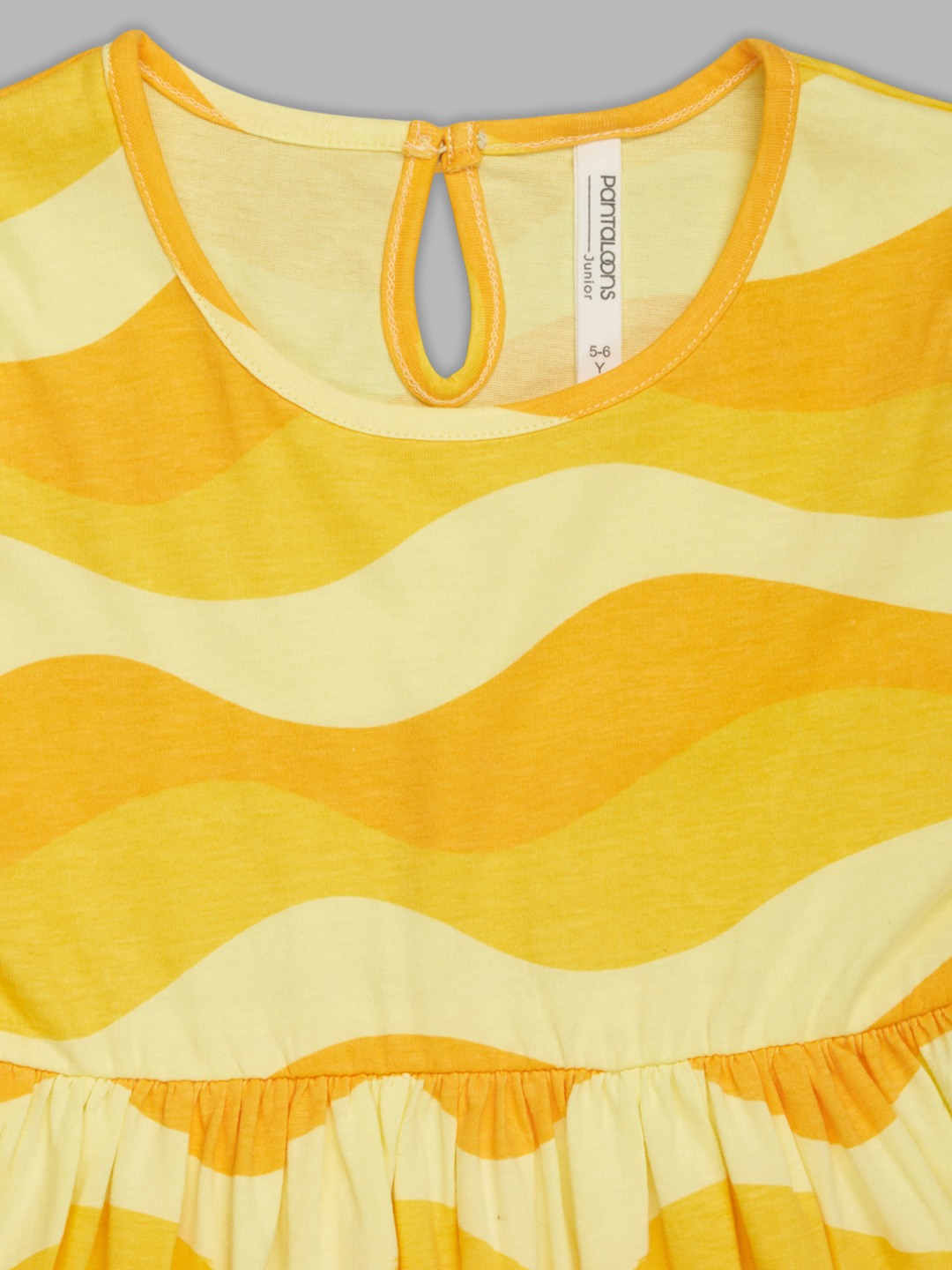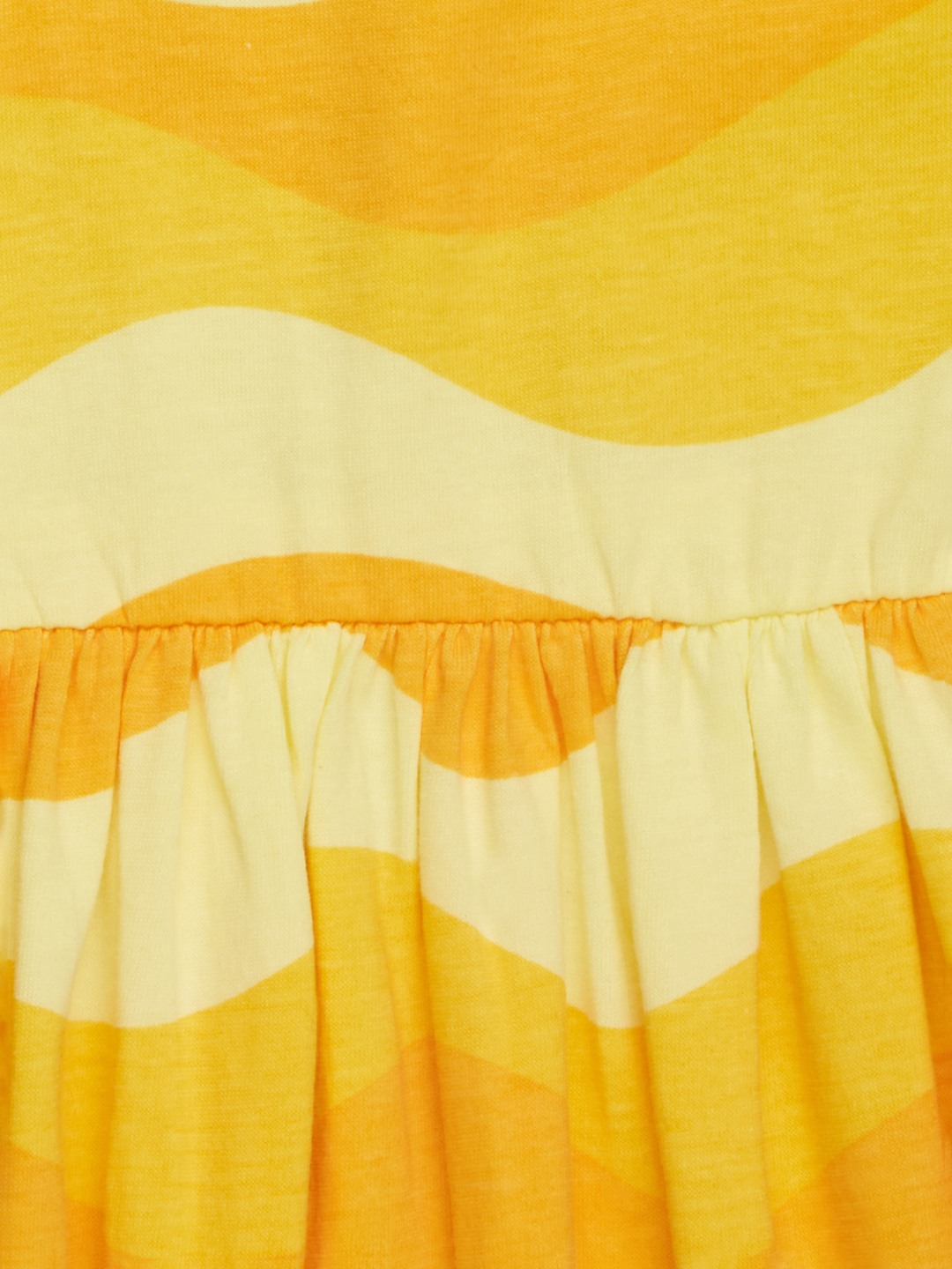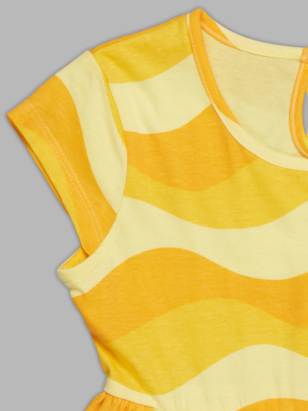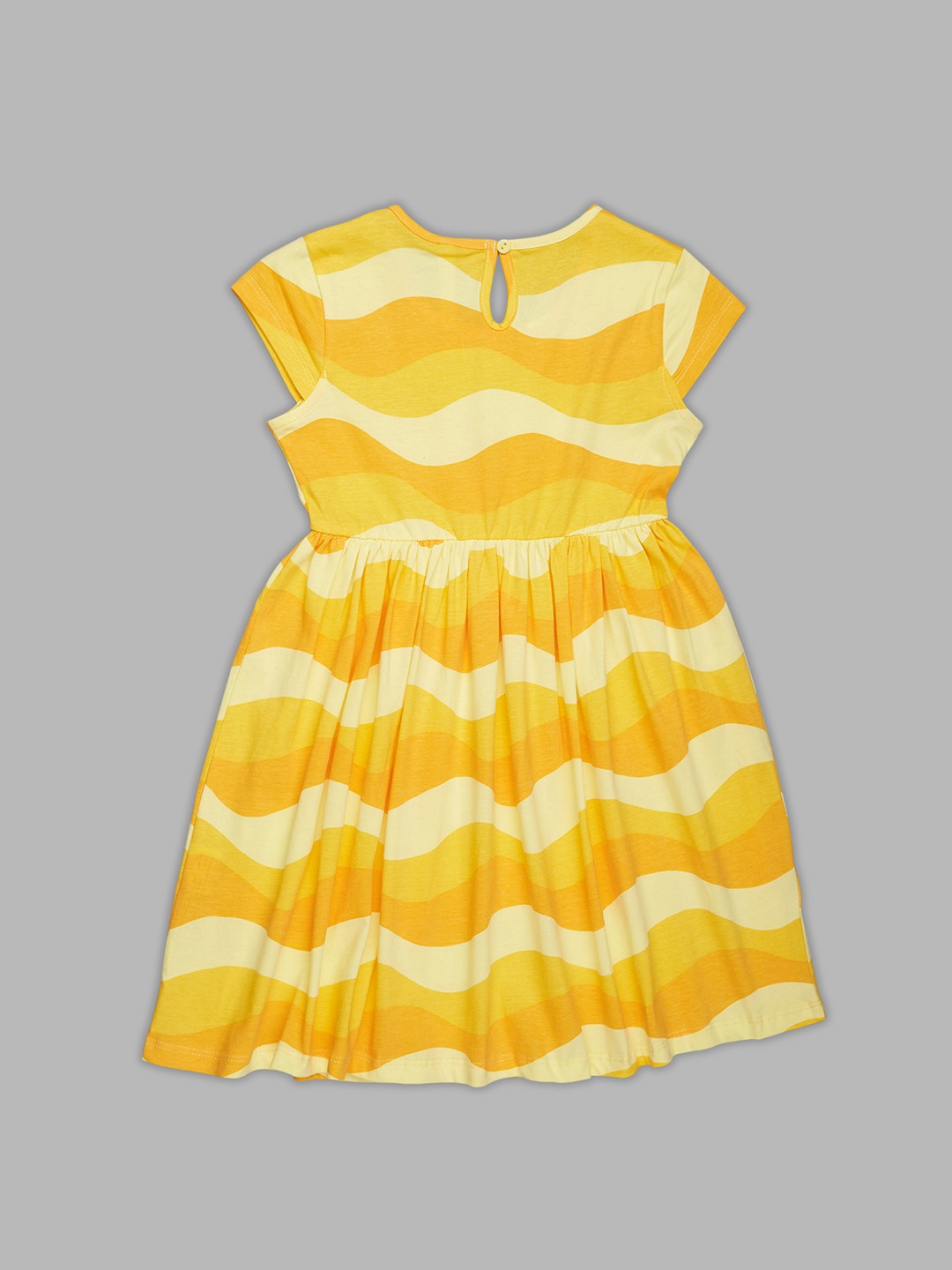 Sunny wave stripes set a bright, cheerful tone on this twirl-friendly dress. It features a round neckline, cap sleeves, a gathered waist, and a back keyhole button closure, all finished in bold, flowing waves that bring a playful, summery mood. The soft jersey knit keeps it lightweight, stretchy, and comfortable for warm days.